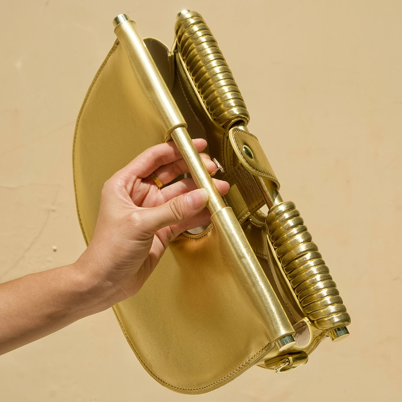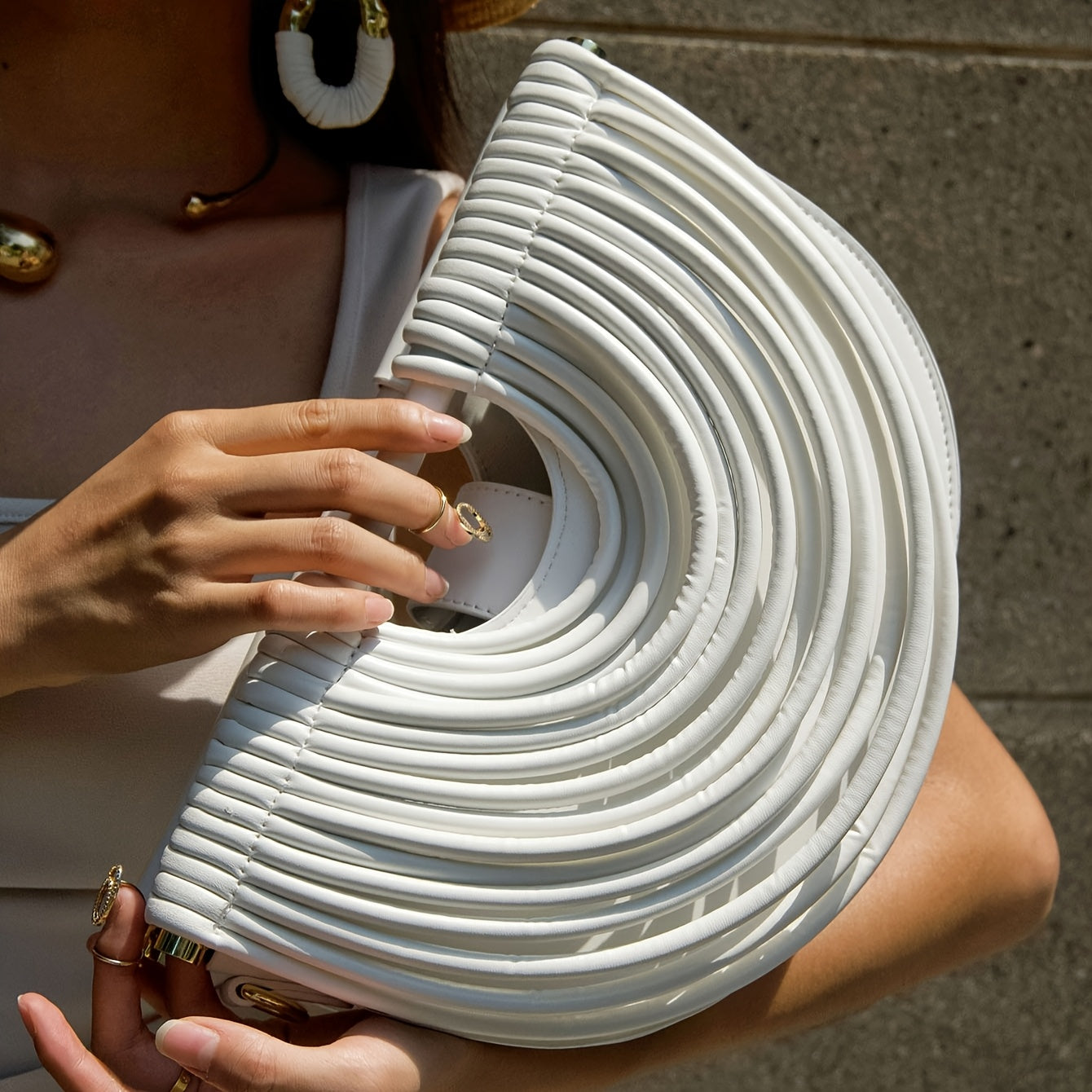 Sonata Crescent - A sculptural crescent bag with layered ripple detailing and a polished top handle. Smooth, genuine leather finish with a detachable crossbody strap, statement-worthy yet roomy for phone, wallet, keys, lipstick, and more.